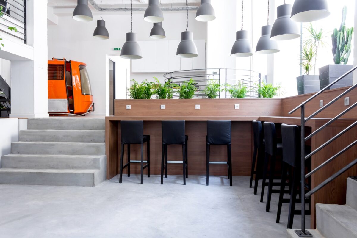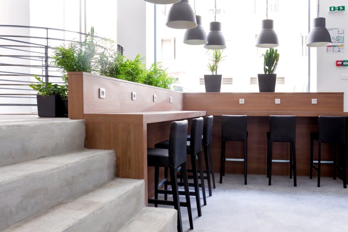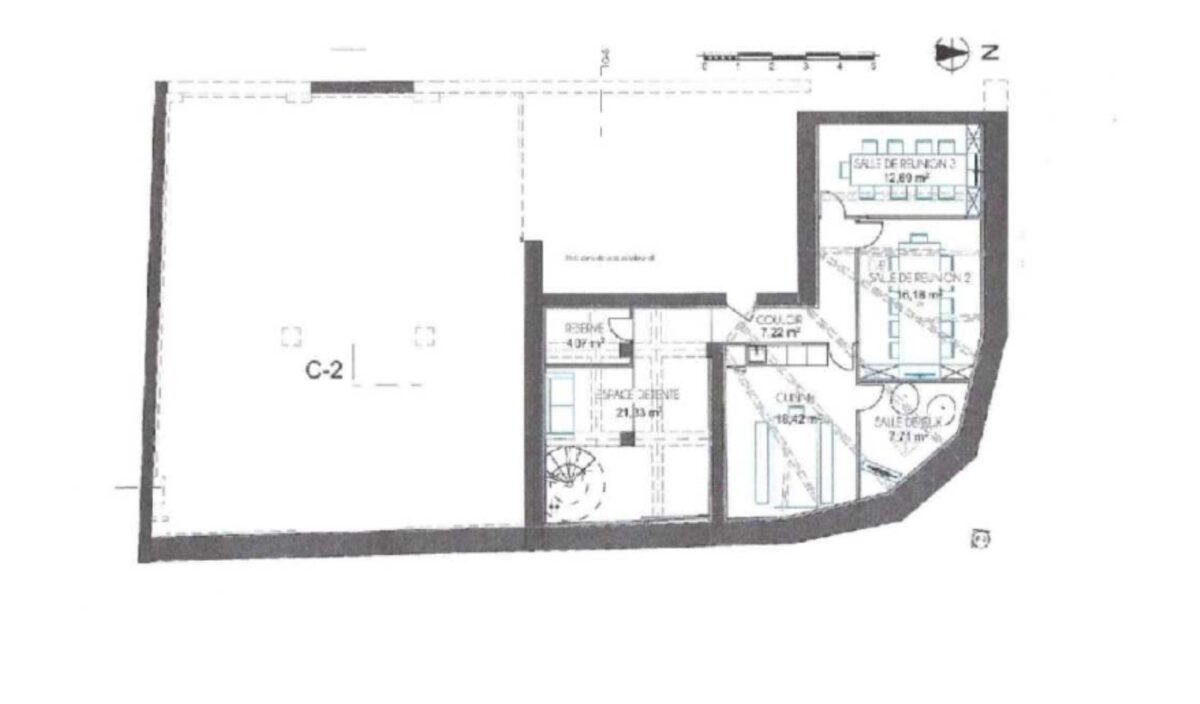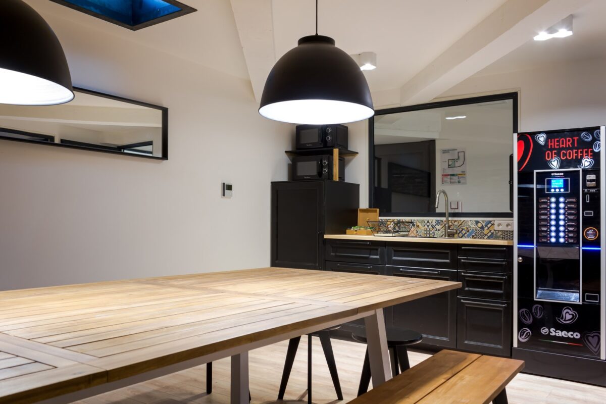Sous sol aménagé en salle de réunion, espace de convivialité et cuisine