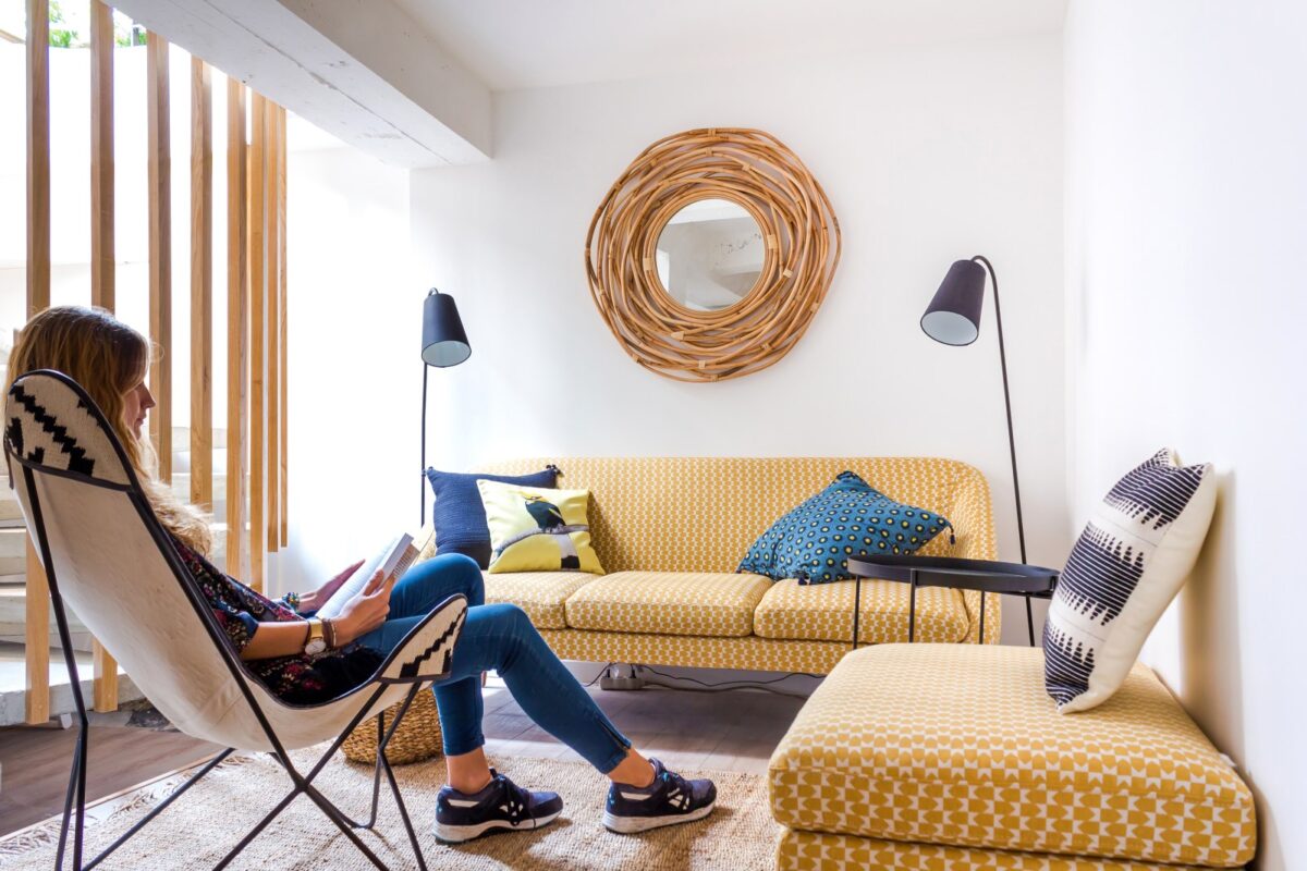Sol en moquette sur la mezzanine, parquet au sous sol et RDC et béton ciré