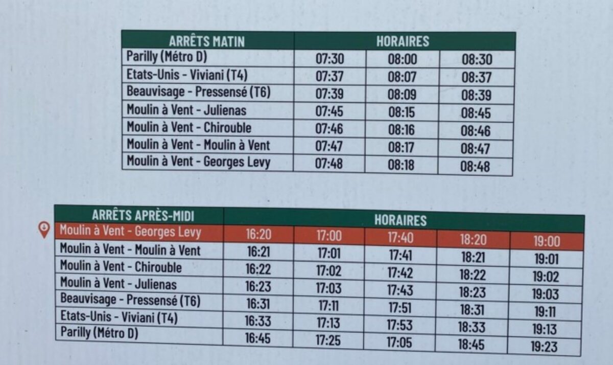 Bus Navette jusqu’aux stations : États-Unis Viviani (tramway T4) et Parilly (métroD)