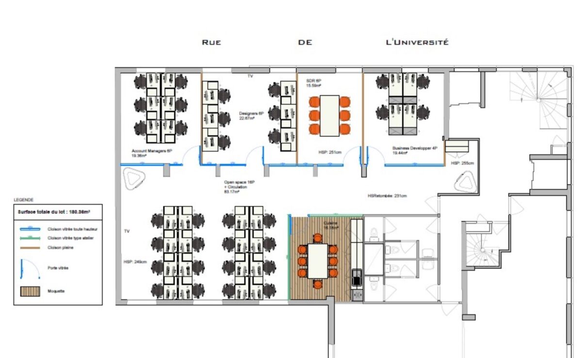 Grands bureaux (6/8 postes), open space, cuisine aménagée, local technique