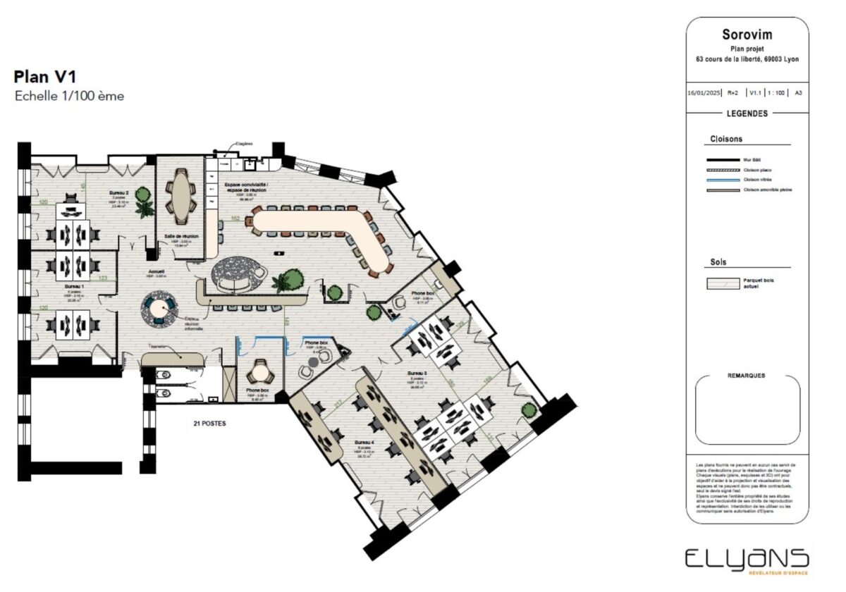 Grand espace d’accueil, 4 bureaux individuels,