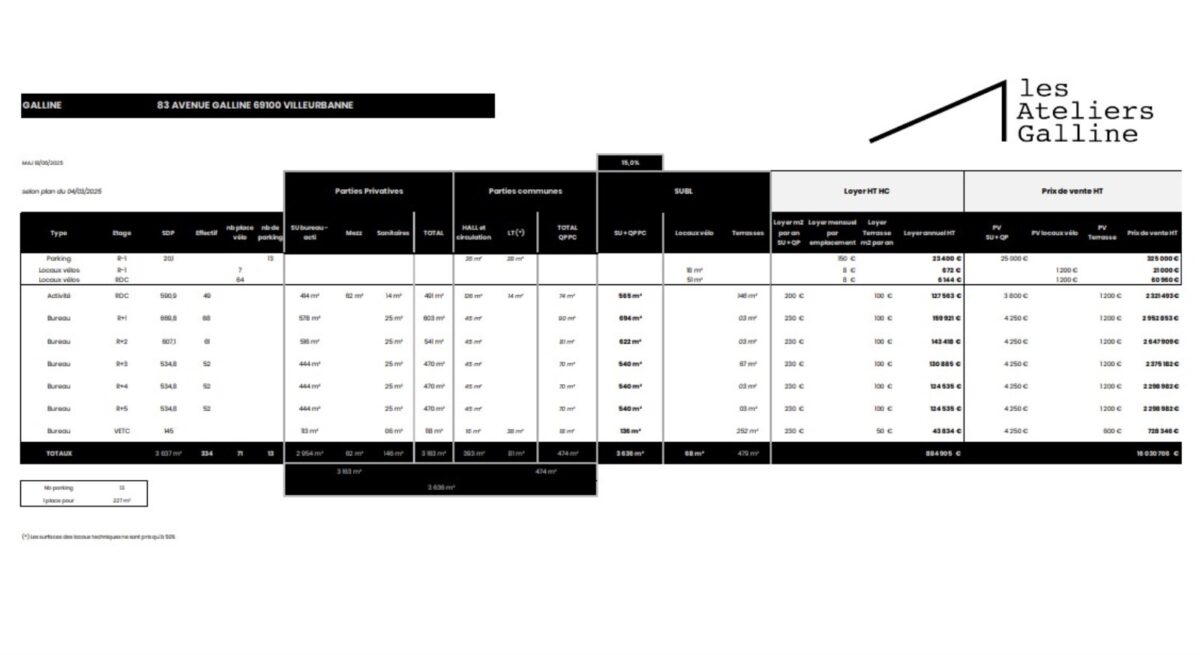 | 4 | Bureaux | 540 | Après accord | 4 250 HT HD/m² | 35 HT/m²/an | 2.5% HT du prix de vente HT HD en sus à la charge de l’acquéreur. | TVA et frais de notaire réduits | |||||||||||