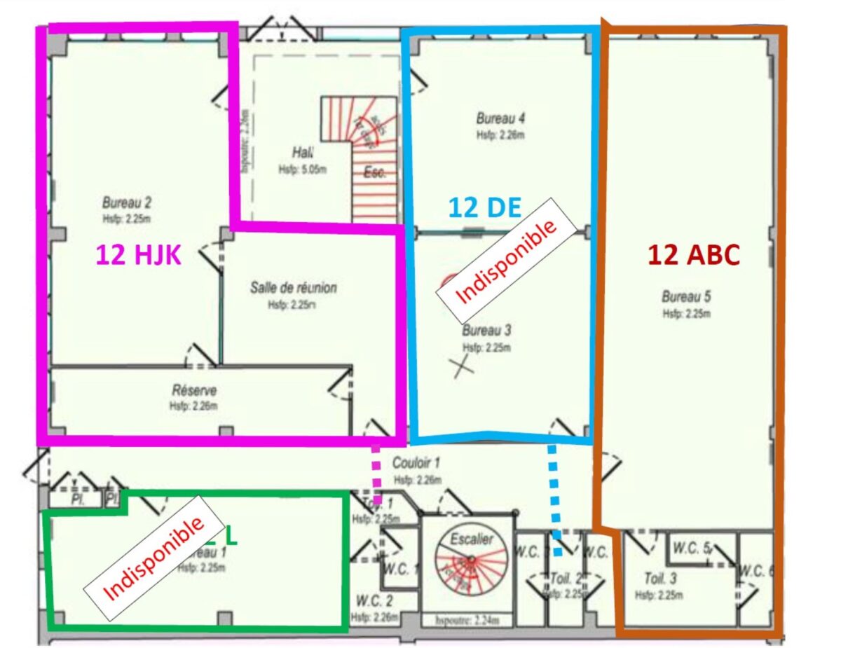 | Étage | Bâtiment | Type | Surfaces | Disponibilité | Loyer | Charges | Honoraires | Fiscal | Bail | Révision annuelle | Prix | Charges | Honoraires | Fiscal | Paiement Loyer | lot | Coworking | |