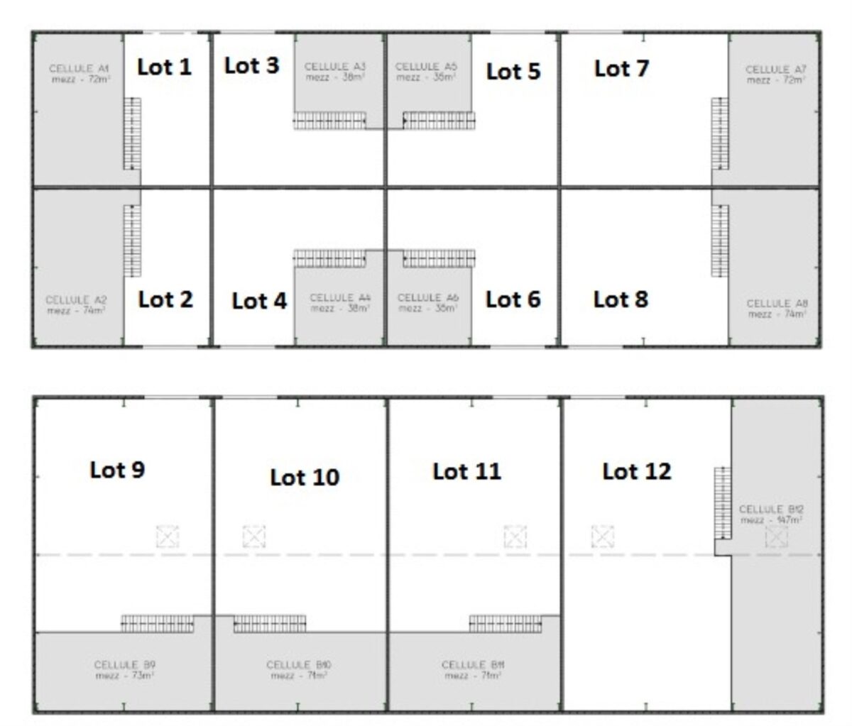 | Total Cellule Lot 12 | Activités | 548 | début 2026 | 1 427,01 HT HD/m² | 3% HT du prix de vente HT, à la charge de l’acquéreur | TVA et frais de notaire réduits | Lot 12 | |||||||||||