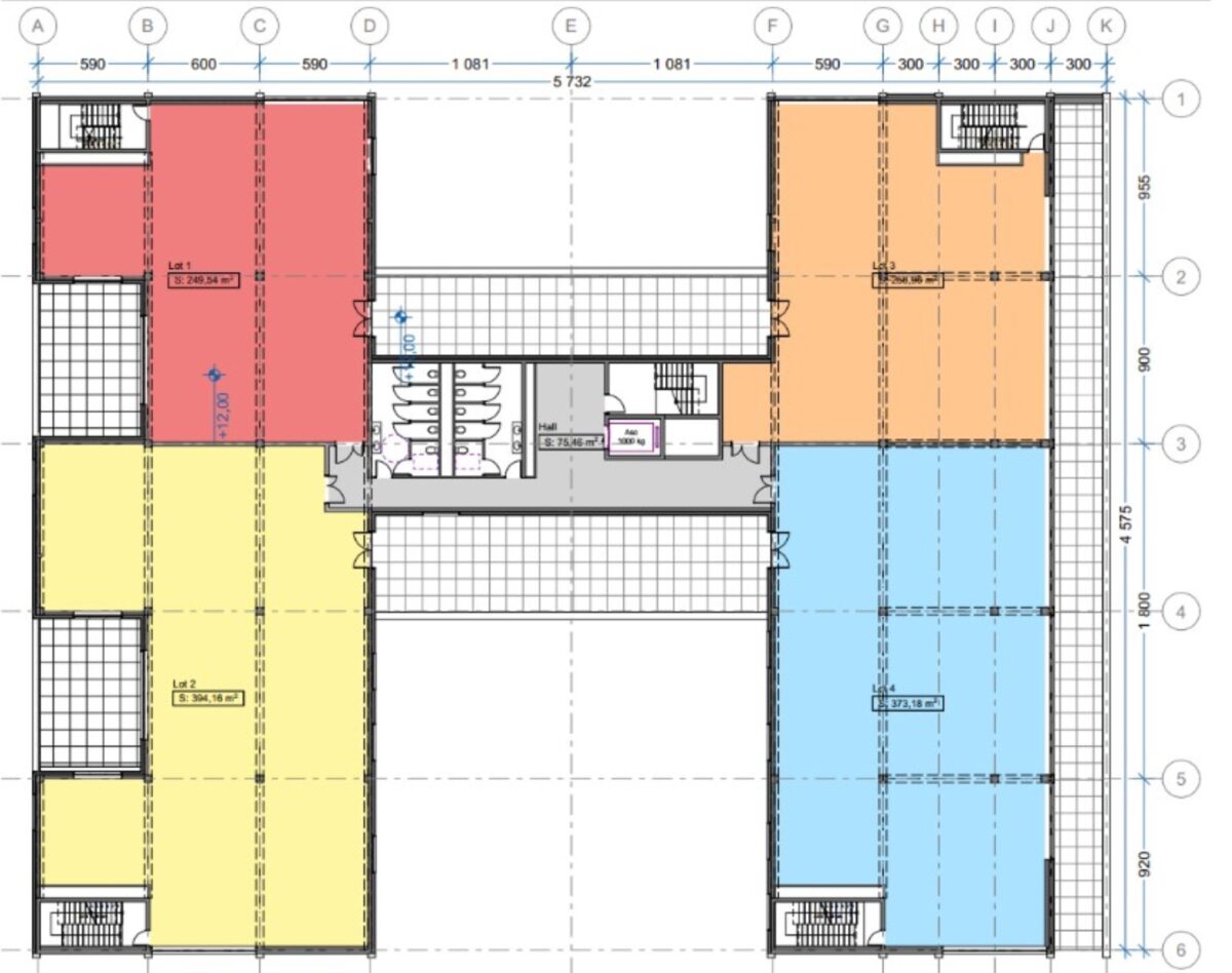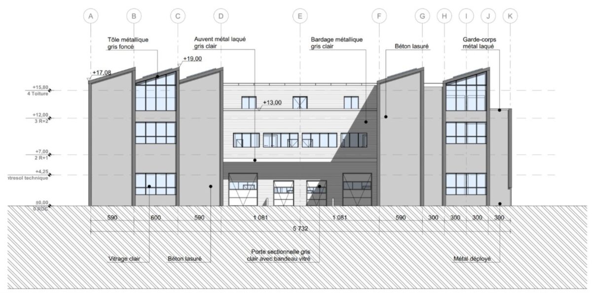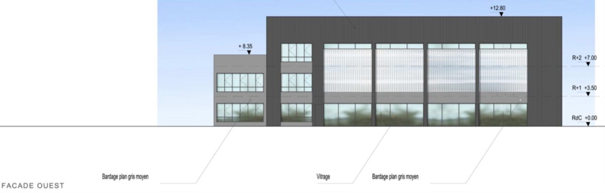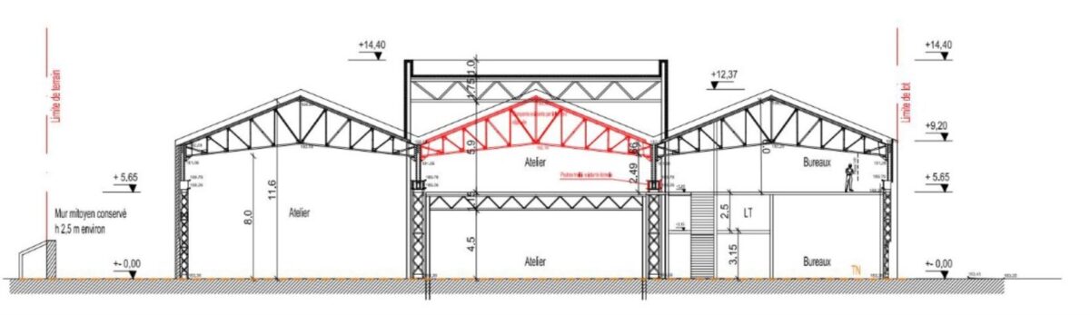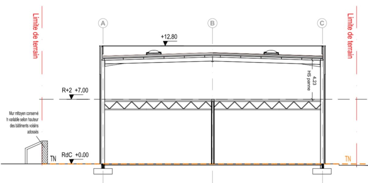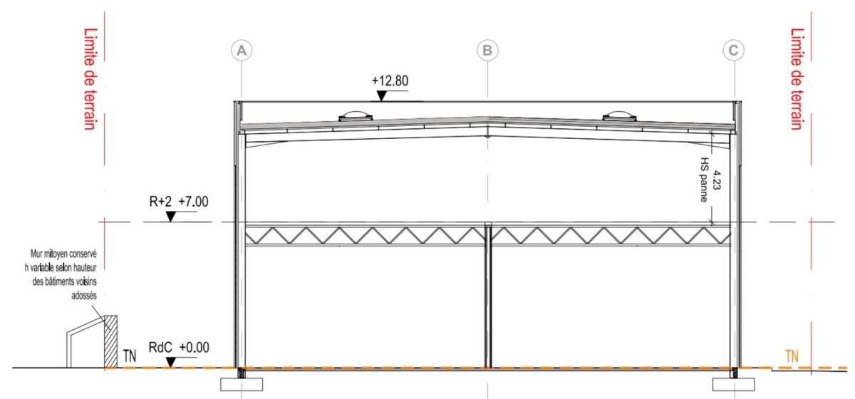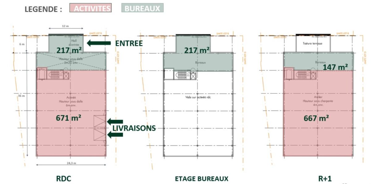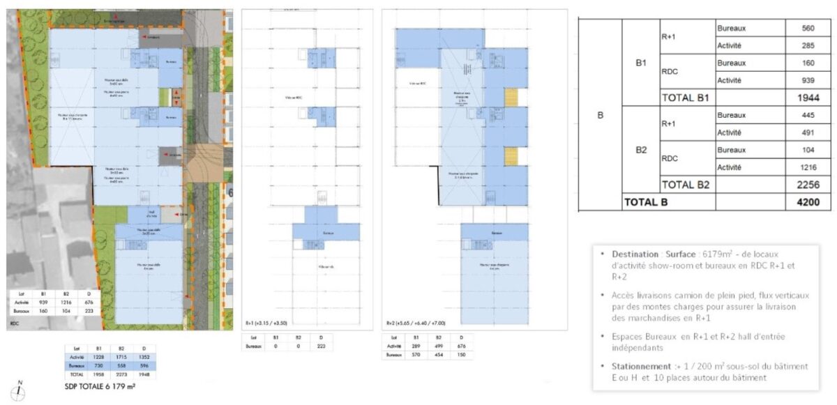 Bâtiment B : hauteur 6m en RDC et 4m en R+2