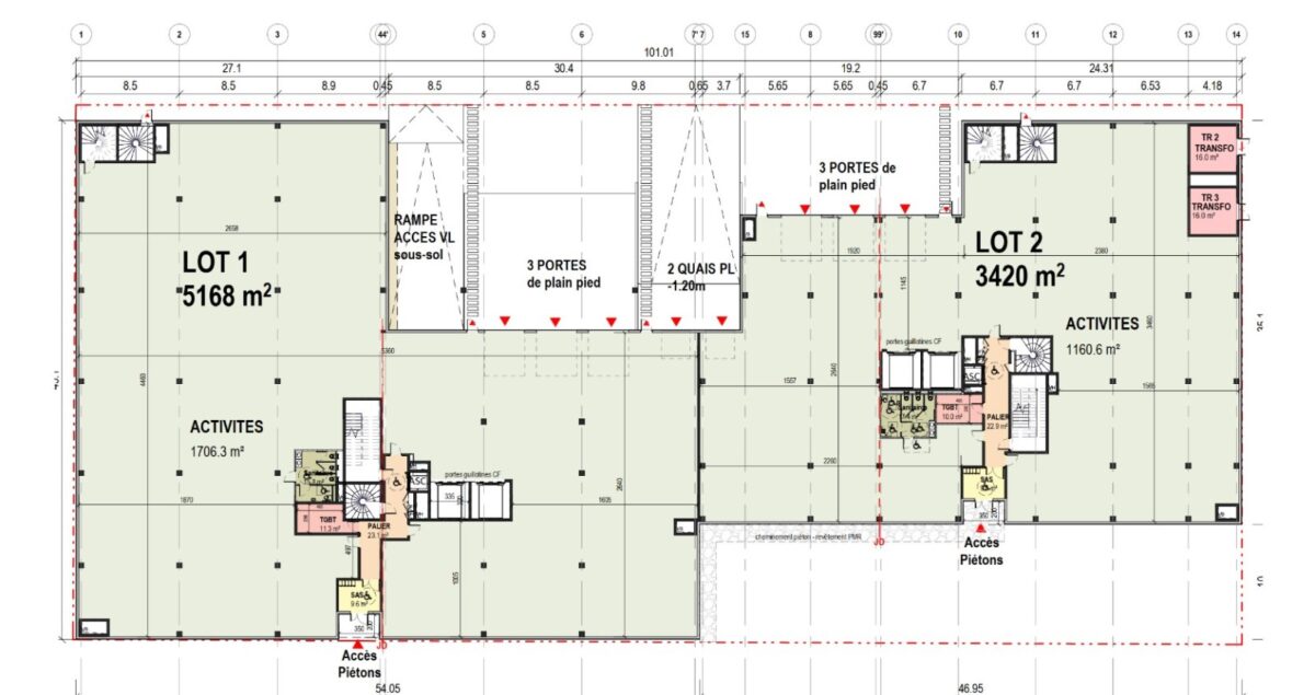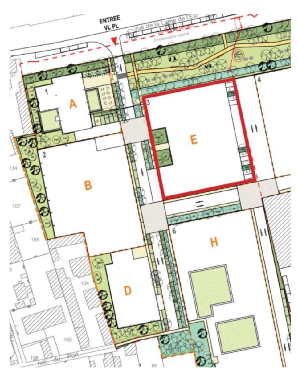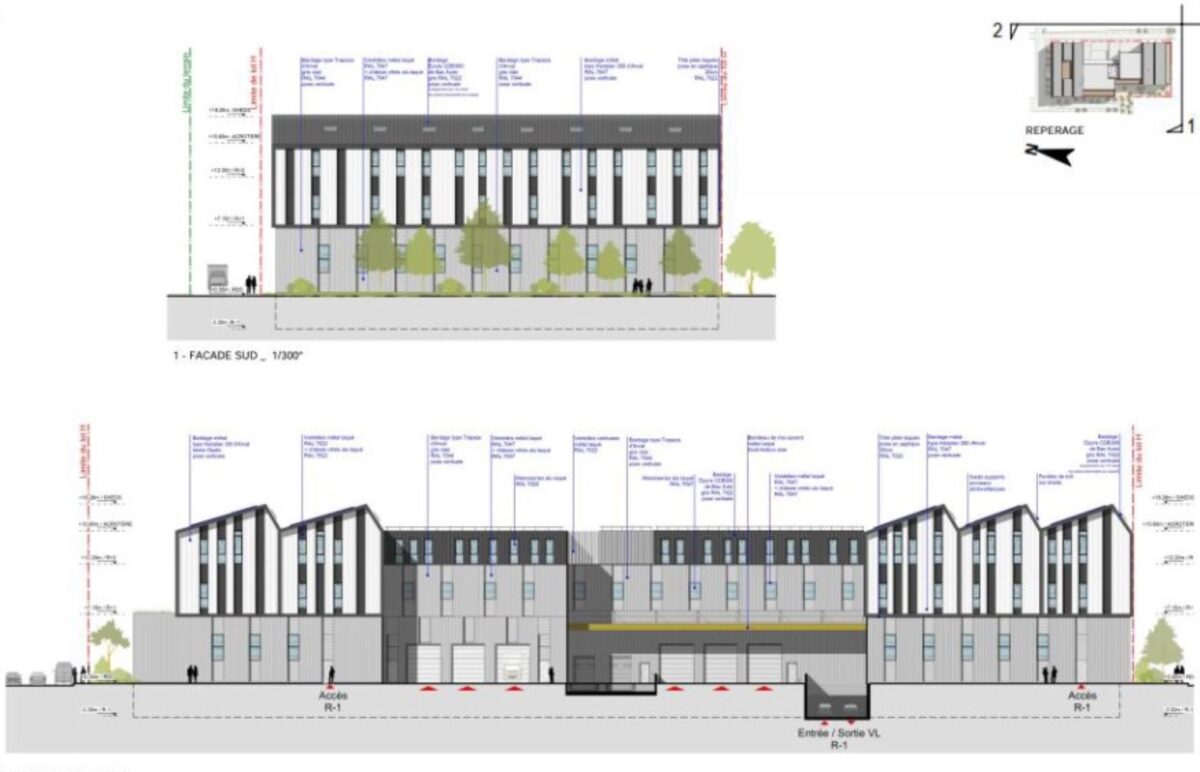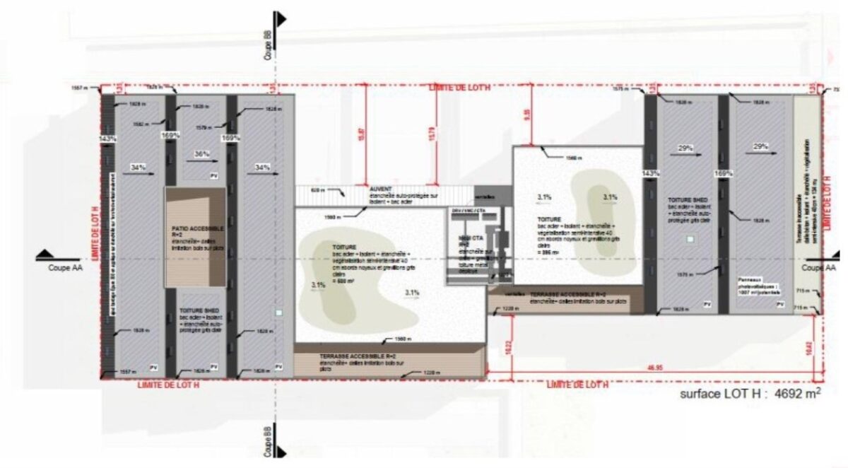 Bâtiment H : 1 quai et 3 portes plain pied par lot. Haute de 6m en RDC et 4.5m en R+1. Toiture végétalisée. 106 parkings.