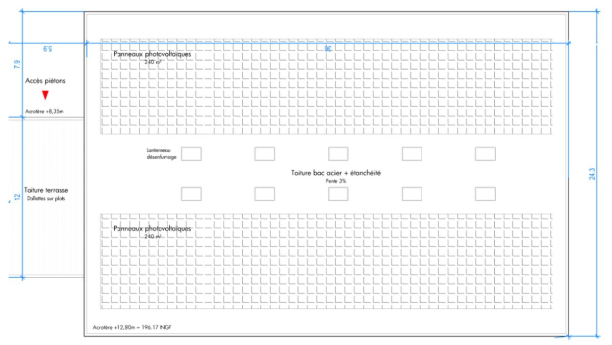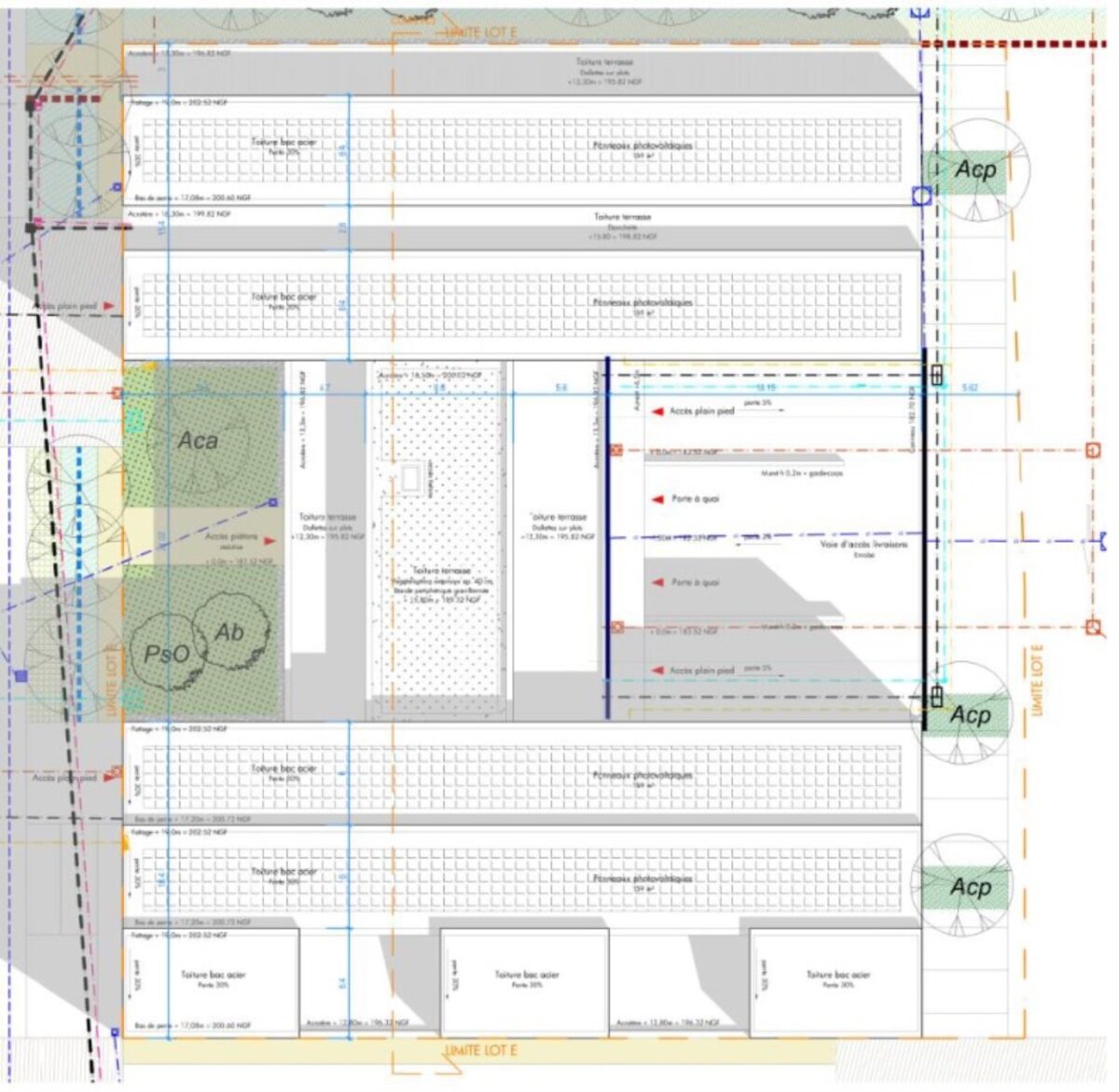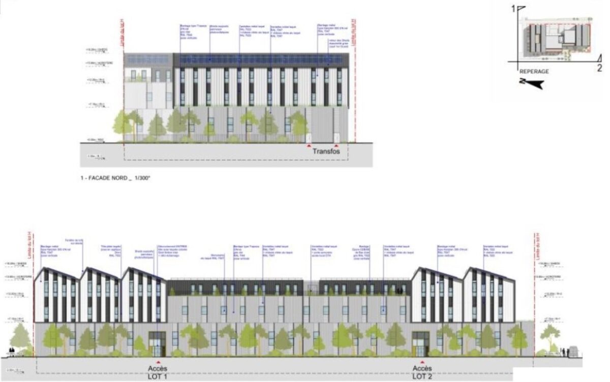 Bâtiment H : 1 quai et 3 portes plain pied par lot. Haute de 6m en RDC et 4.5m en R+1. Toiture végétalisée. 106 parkings.