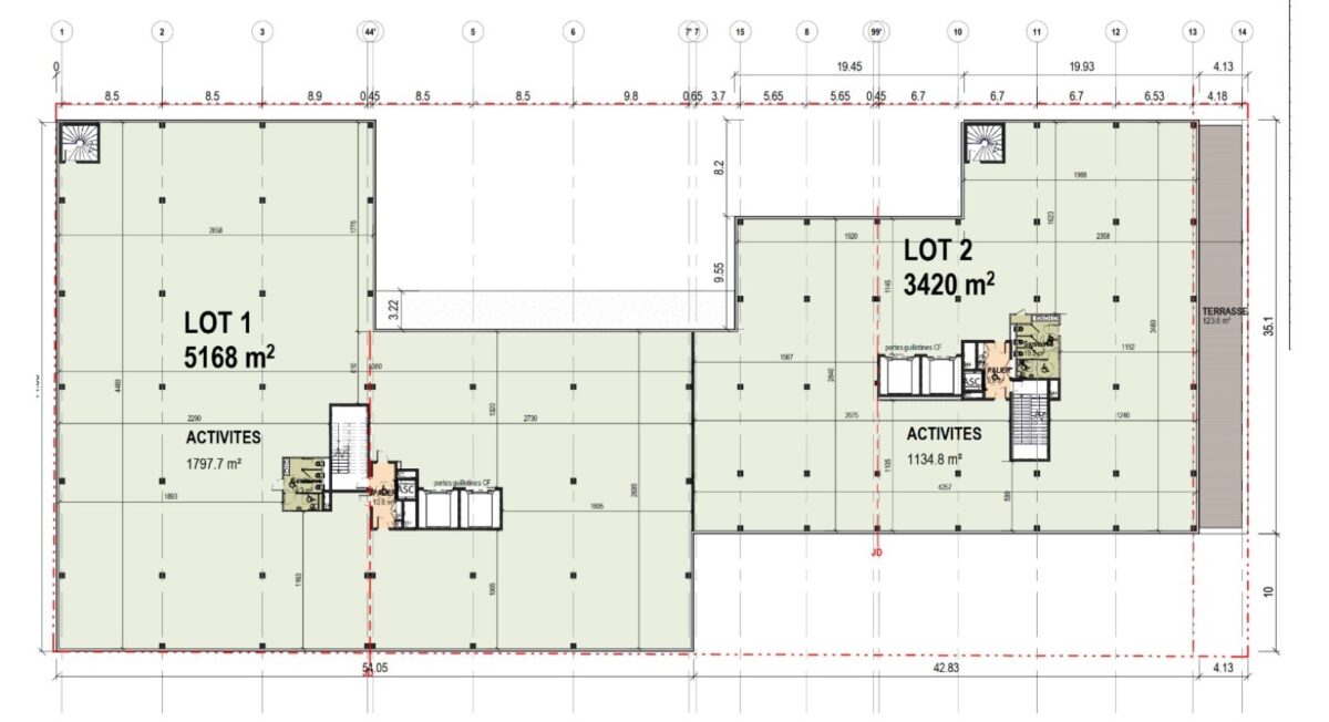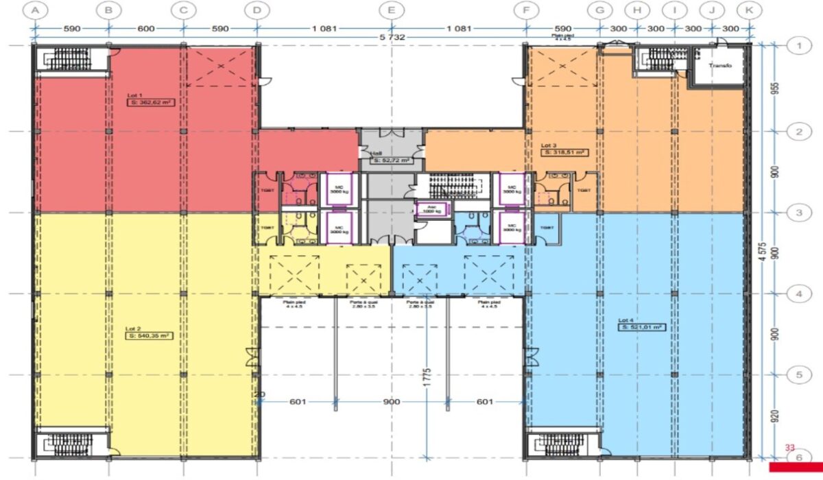 Bâtiment E : hauteur de 6.5m en RDC avec dalle 2T/m². Dalles intermédiaires de 750 kg/m². 2 quais et 2 portes plain pied. Monte charge. 52 parkings.