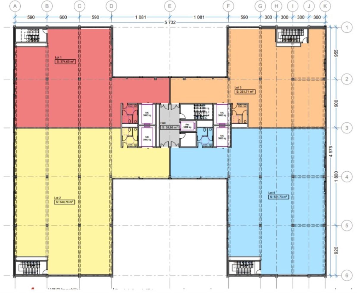 Bâtiment E et H : bureaux livrés aménagés non cloisonnés.